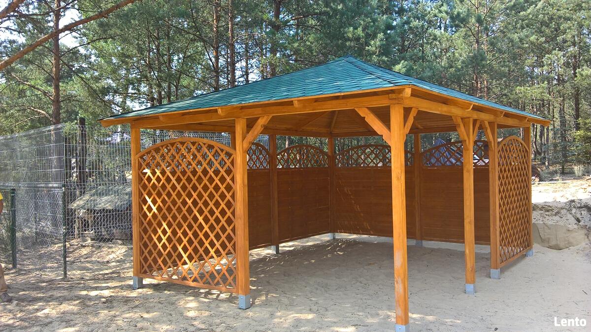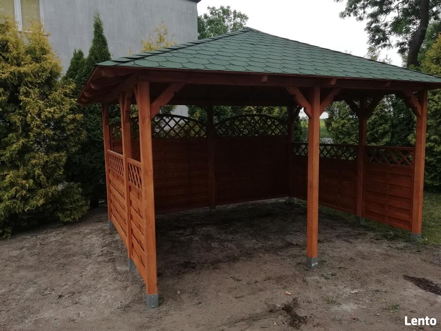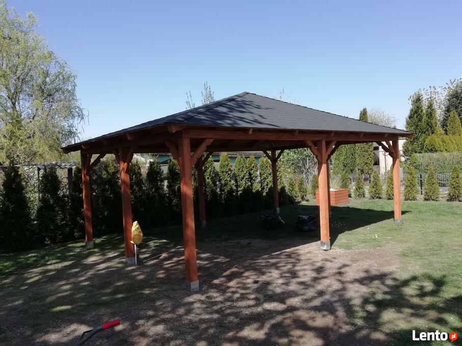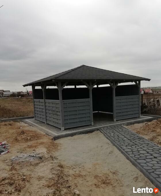 Nasze produkty wykonane są z deski boazeryjnej szalunkowej 22 mm grubości , słupy (10 na 10 , 12 na 12 , 14 na 14 cm) zależy od wielkości danego produktu , na dachu bity gont jest bitumiczny (kolor do wyboru przez klienta) malujemy na raz w cenie zamówienia . Montujemy sami na miejscu u klienta -MONTAŻ JEST GRATIS !